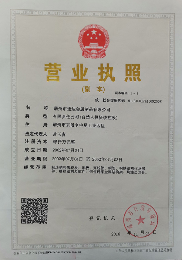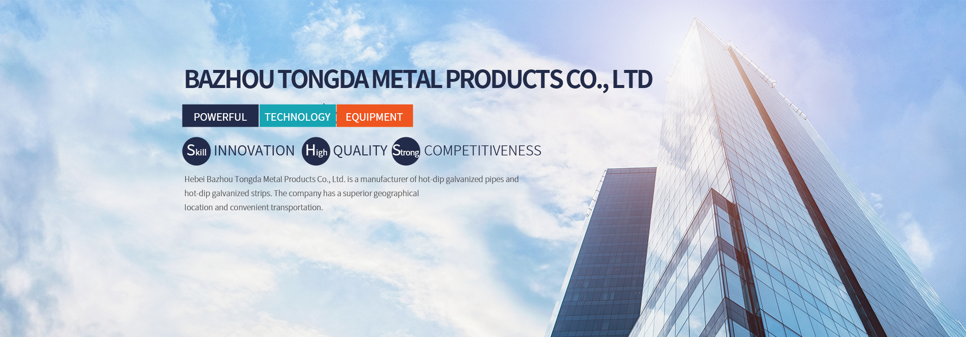 Hebei Bazhou Tongda Metal Products Co., Ltd. is a manufacturer of hot-dip galvanized pipes and hot-dip galvanized strips. The company has strong economic strength. The company has an advantageous geographical location and convenient transportation. It is located in Shengfang Town, the intersection of the four major cities of Beijing, Tianjin and Baocang. As the company continues to grow and develop, it has set up a branch: Yongqing Longtai Metal Products Co., Ltd. A good investment environment provides a reliable guarantee for the development of our company. The company is a contract-honoring and trustworthy enterprise in Hebei Province, and has been rated as an AAA credit enterprise.